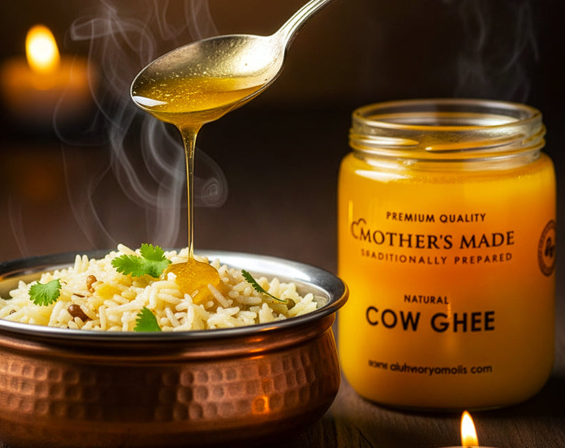 Buffalo & Cow Ghee, slow-prepared the traditional way — rich, wholesome, and full of flavor.