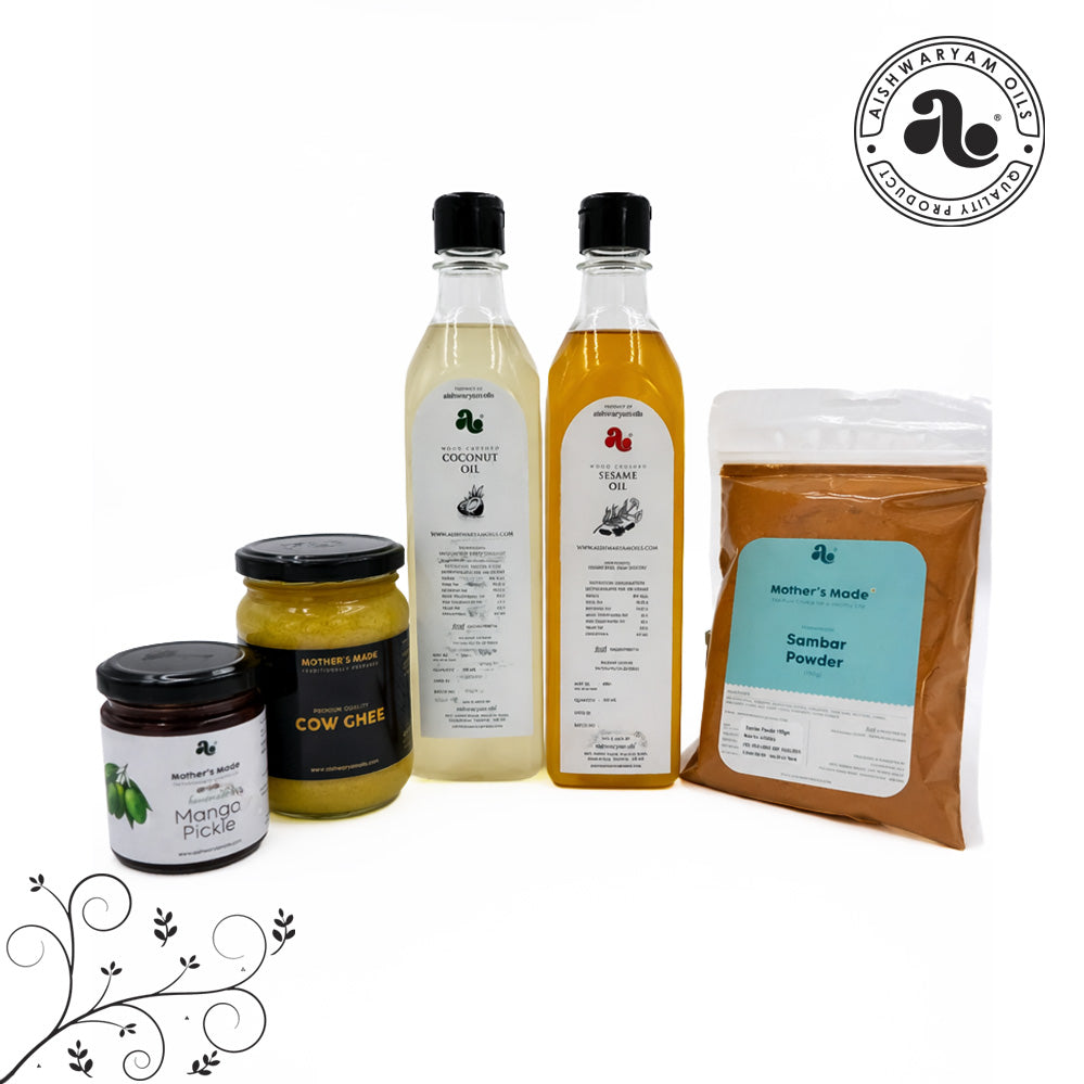 A complete set of everyday South Indian cooking essentials, prepared using traditional methods and simple ingredients. This combo combines wood-crushed oils, slow-prepared cow ghee, a classic mango pickle, and authentic sambar powder—bringing together the core flavours used in daily home cooking.
